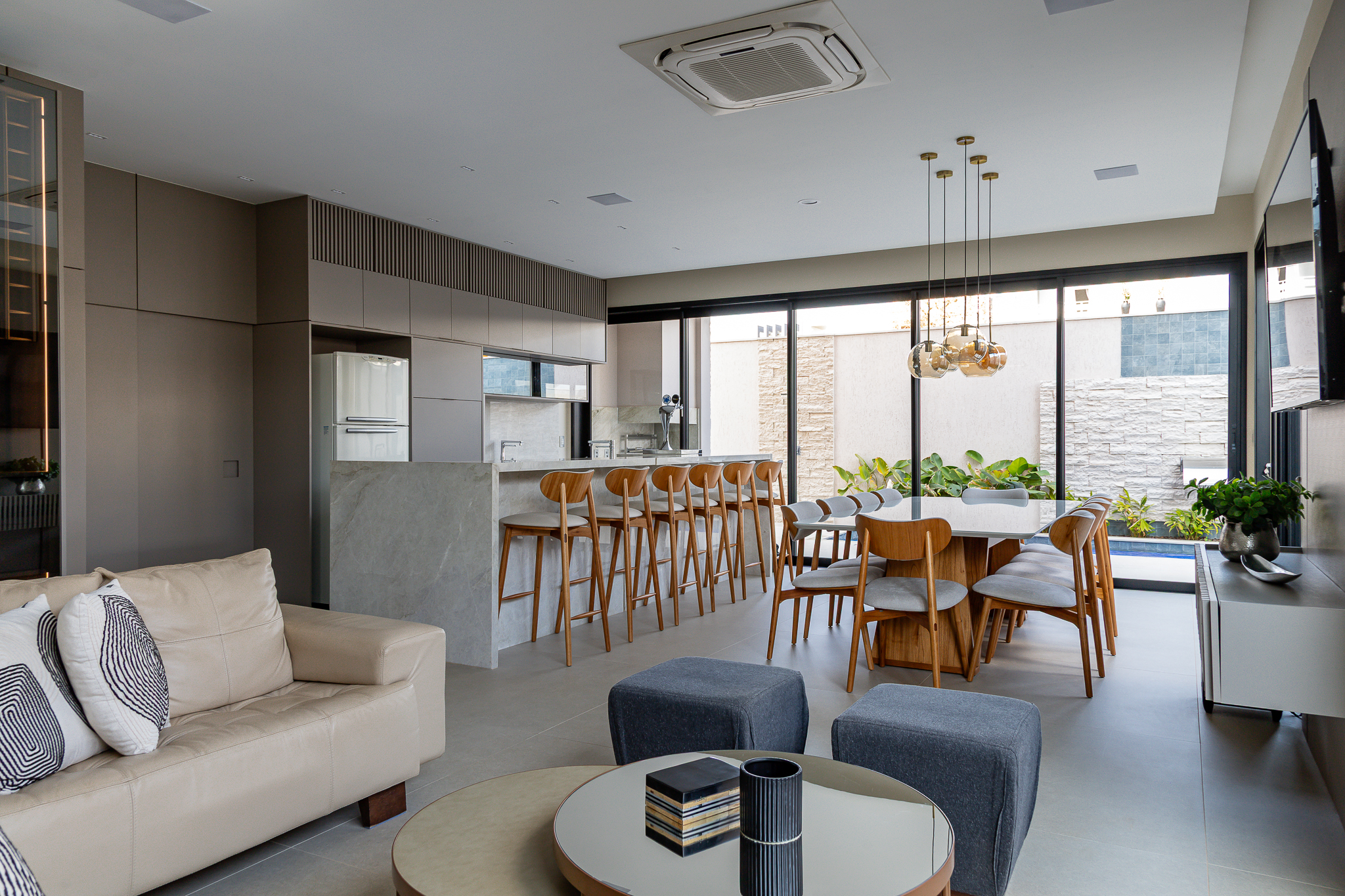Abeleza dos paineis em marcenaria, que abraçam a residência, tornando o ambiente único, sofisticado.