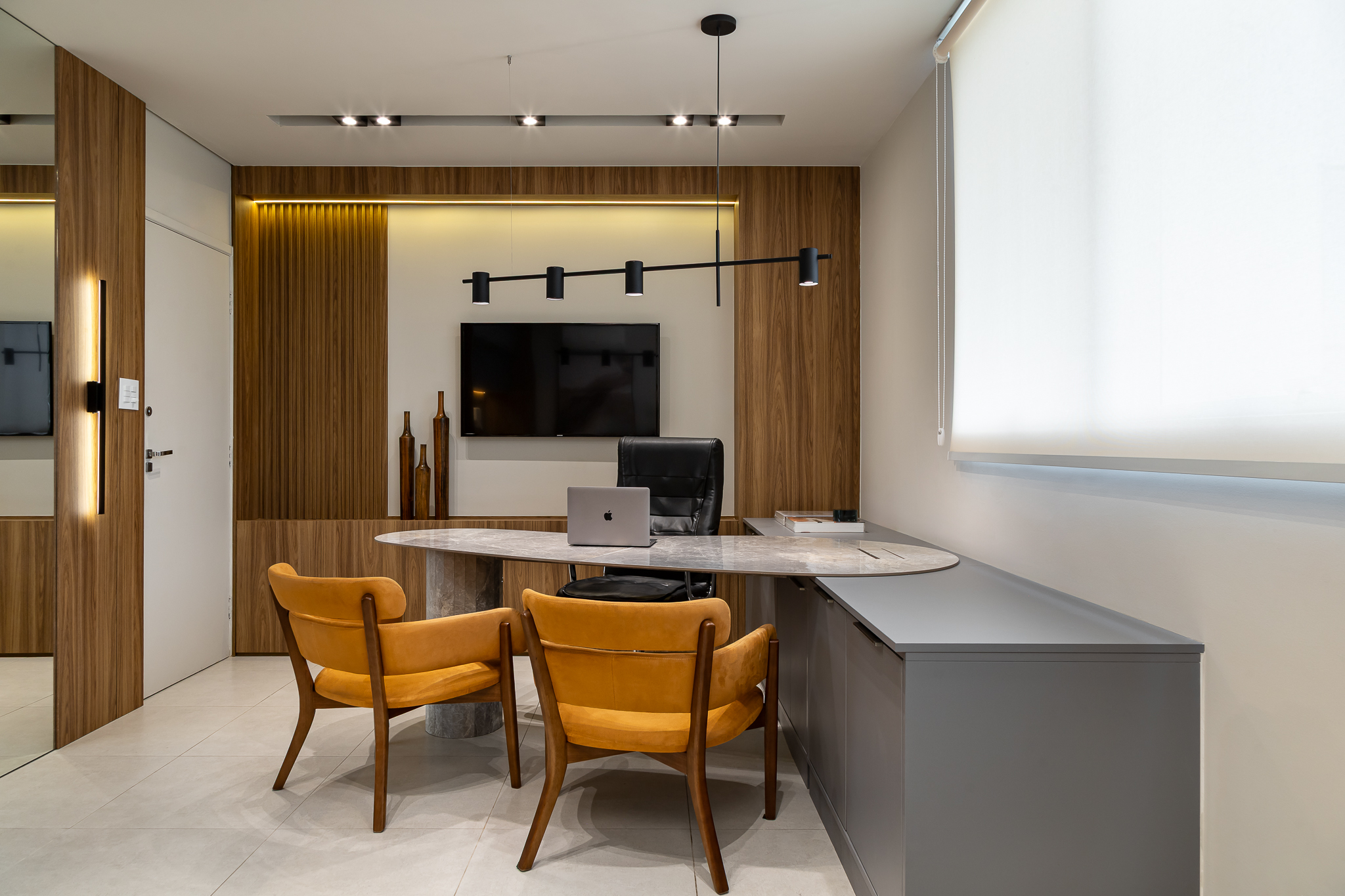 A madeira abraça as linhas retas, e a estante com linhas bem finas trazem leveza, tudo pensado para uma experiêcia única.
